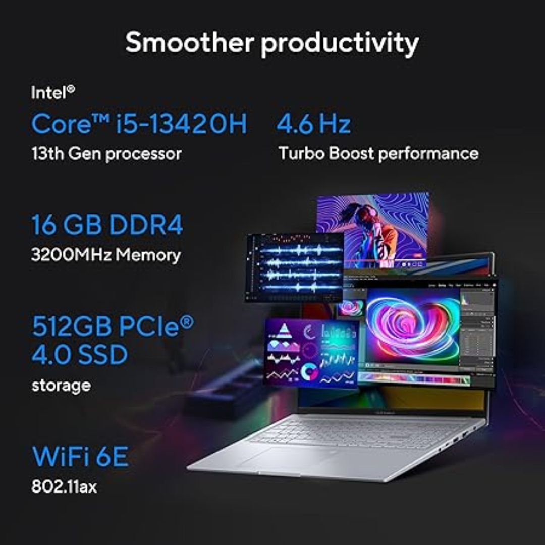 ASUS Vivobook 16X K3605VC-RP413WS is a powerful and stylish laptop built for creators, gamers, and multitaskers. Equipped with the 13th Gen Intel Core i5-13420H processor and NVIDIA GeForce RTX 3050 4GB graphics, it delivers smooth and responsive performance for demanding tasks like video editing, design work, and gaming. The expansive 16-inch FHD+ display (1920 x 1200) with a 16:10 aspect ratio offers a vibrant and immersive viewing experience. With 16GB DDR4 RAM and a fast 512GB SSD, you can enjoy quick boot times, effortless multitasking, and ample storage. It runs on Windows 11 Home Basic (1 Year). Finished in a sleek Cool Silver and weighing just 1.80 kg, it combines portability with premium functionality — perfect for professionals and students alike.