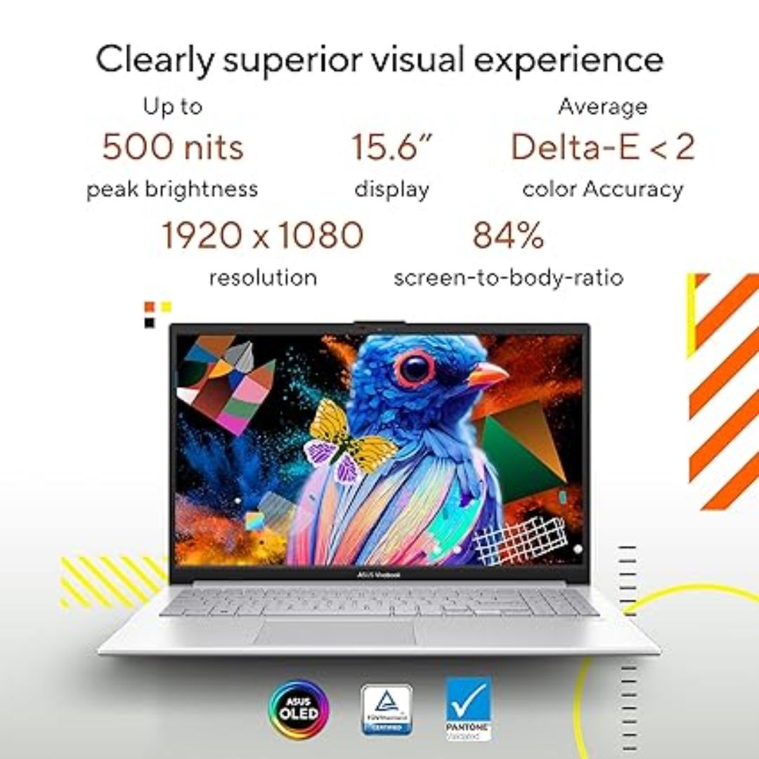 Vivobook Go 15 OLED has stunningly crisp and clear visuals, with a reduced risk of eye strain during long viewing sessions thanks to its TÜV Rheinland eye-care certified OLED panel. The NanoEdge slim-bezel design gives you more screen space for multitasking and immersive viewing.