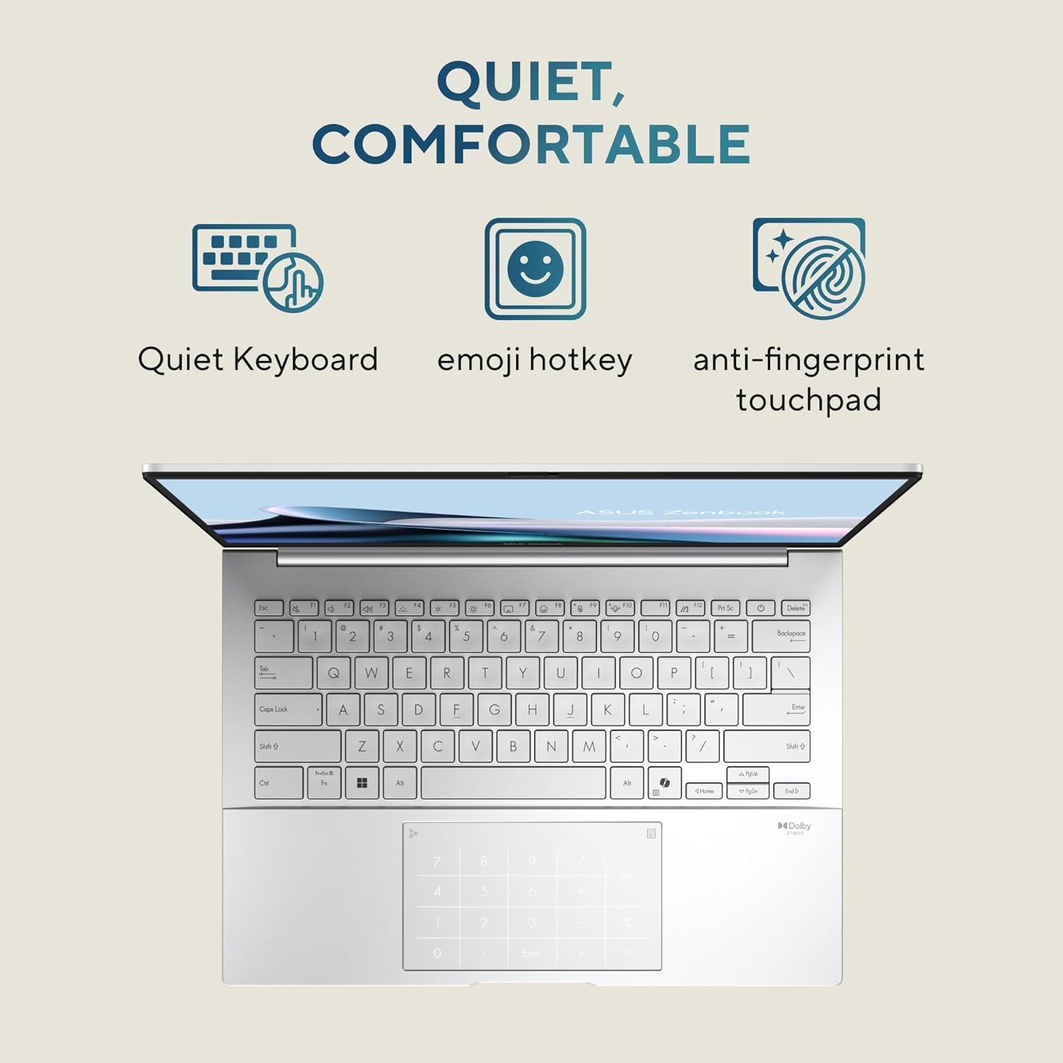Built for portability, the Zenbook 14 OLED is just 1.49 cm thin and weighs only 1.28 kg, making it perfect for on-the-go professionals. The 75WHrs battery supports all-day productivity, while Dolby Atmos-certified speakers provide an immersive sound experience.