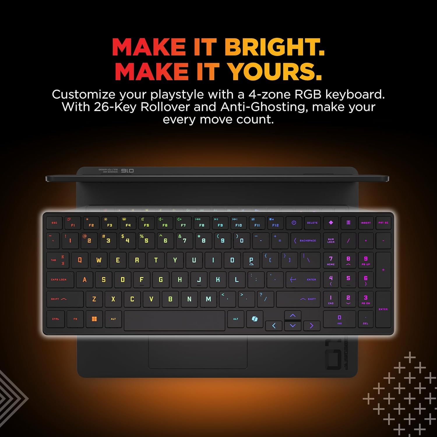 The laptop features 24GB DDR5 RAM and a 1TB SSD, ensuring fast boot times, smooth multitasking, and ample space for games and files.