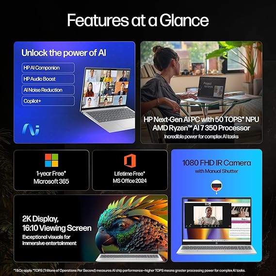 It features the AMD Ryzen AI 7 350 processor with 50 TOPS AI capability, enabling advanced AI features such as Copilot+, Windows Studio Effects, and HP AI Companion.
