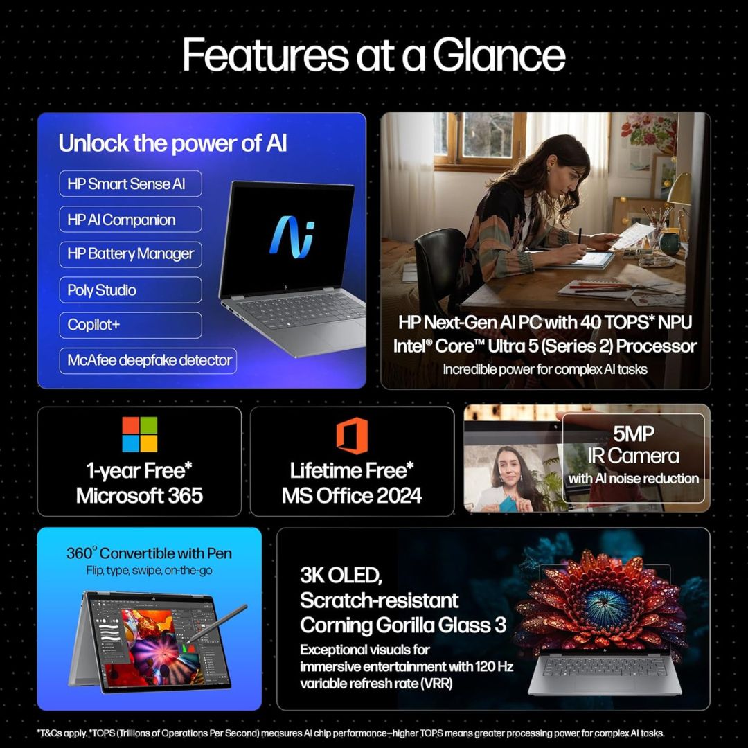 HP Omnibook X Flip 14-fm0058TU redefines versatility and AI-powered performance. Equipped with the latest Intel Ultra 5-226V processor, 16GB LPDDR5X RAM, and 512GB PCIe Gen4 SSD, it delivers lightning-fast computing and seamless multitasking. The 14” 3K OLED touchscreen offers vibrant visuals with 48-120Hz VRR and low blue light for eye comfort. Designed as a 2-in-1 convertible, it includes a pen for precision creativity and note-taking. AI enhancements like Windows Studio Effects, HP AI Companion, and smart presence sensing elevate productivity and user experience. Perfect for professionals, students, and creators, this sleek Meteor Silver device comes with Microsoft Office Home 2024 and PC Game Pass for work and entertainment.