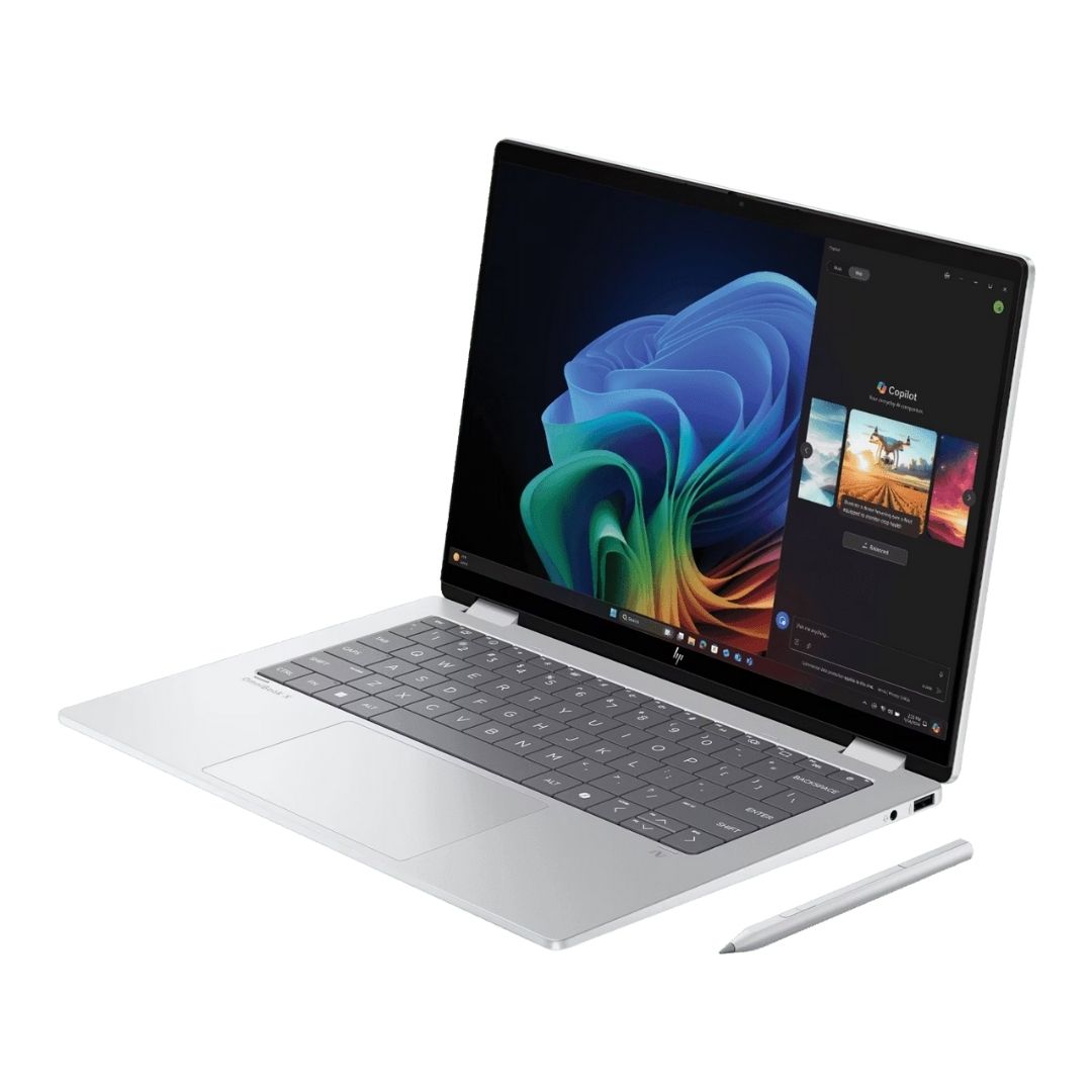 The HP OmniBook X Flip OLED (fm0099TU), a refined evolution of the Envy series, is a cutting-edge 2-in-1 AI laptop built for professionals and creators. Powered by the Intel Core Ultra 5 226V processor with 40 TOPS AI capability, it delivers smart, efficient, and adaptive computing. The immersive 14-inch 3K OLED touchscreen, featuring a 120Hz refresh rate, ensures breathtaking visuals with rich contrast and lifelike colors. Designed for flexibility, the convertible form allows seamless transition between laptop and tablet modes. Crafted from premium aluminum in a sleek silver finish, it weighs only 1.38kg for on-the-go convenience. With 16GB LPDDR5X RAM, 1TB SSD storage, Windows 11, and Office 2024 preinstalled, the OmniBook X Flip OLED is engineered for those who demand performance, versatility, and elegance in a next-generation AI laptop.
