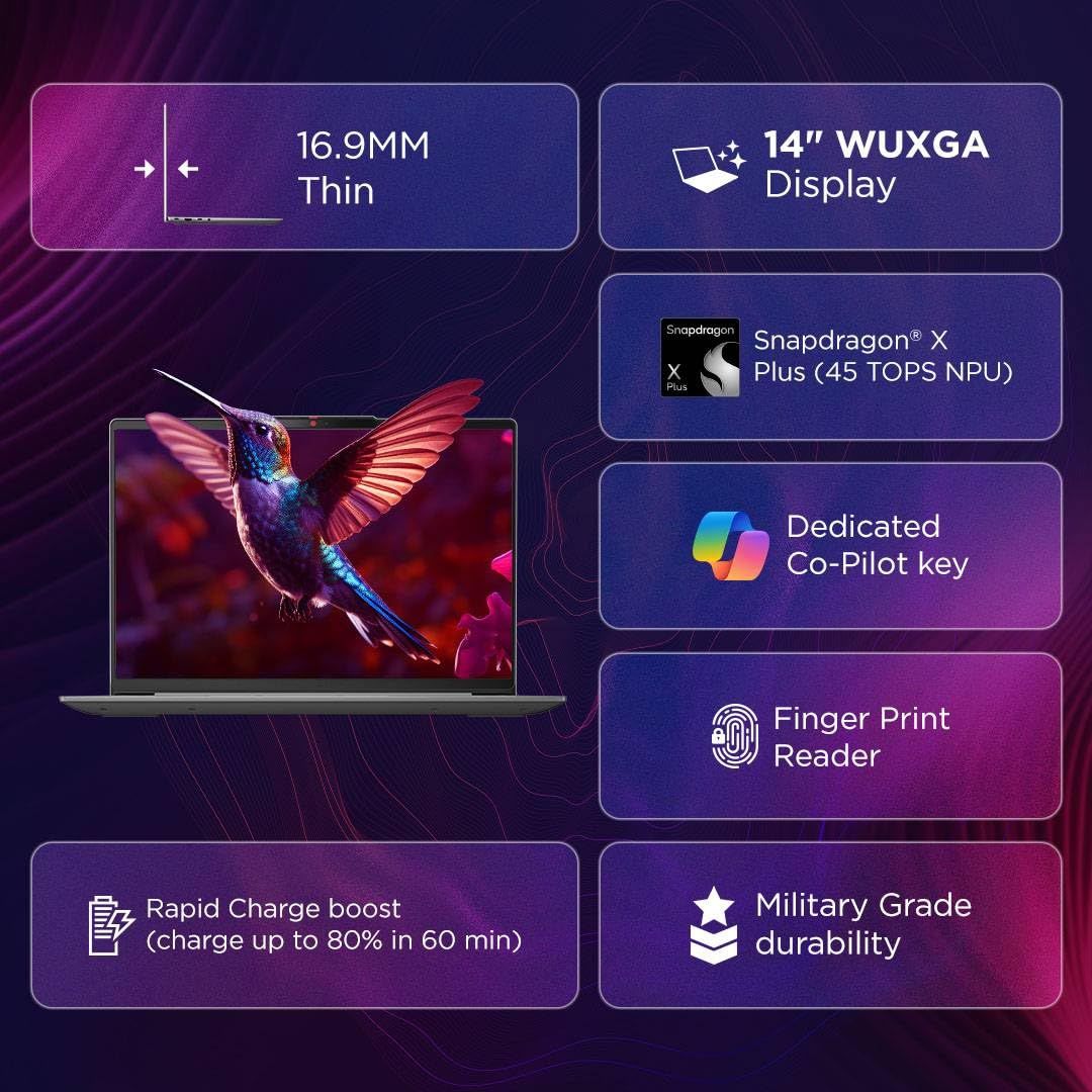 The Lenovo IdeaPad Slim 5 Snapdragon X Plus (83HL0035IN) redefines laptop performance with next-generation Copilot+ AI capabilities. Equipped with the powerful Snapdragon X Plus processor and 45 TOPS NPU, it delivers lightning-fast performance, seamless multitasking, and advanced AI-assisted tools. Its 14-inch WUXGA IPS display offers vibrant visuals, while the 16GB RAM and 1TB SSD ensure smooth performance and ample storage. Designed for portability and efficiency, this 1.89 kg AI-powered laptop runs silently and stays cool. Perfect for professionals, students, and creators seeking smart, efficient, and future-ready computing.