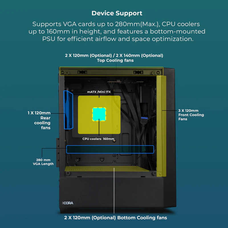 Engineered with a high-airflow internal structure, this cabinet ensures efficient cooling for sustained performance during long gaming sessions or high-load multitasking. Compatible with ATX, Micro-ATX, and Mini-ITX motherboards, ZEB-CORA provides the flexibility to build anything from a compact system to a powerful gaming rig. The bottom-mounted PSU design supports cleaner cable management and ensures optimal heat distribution.