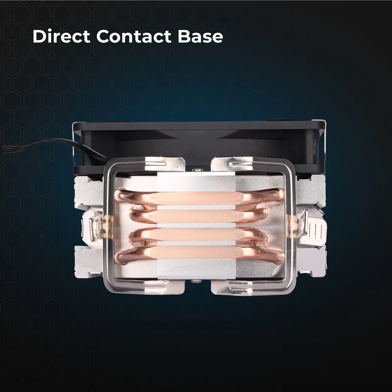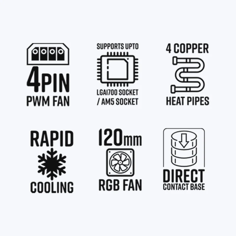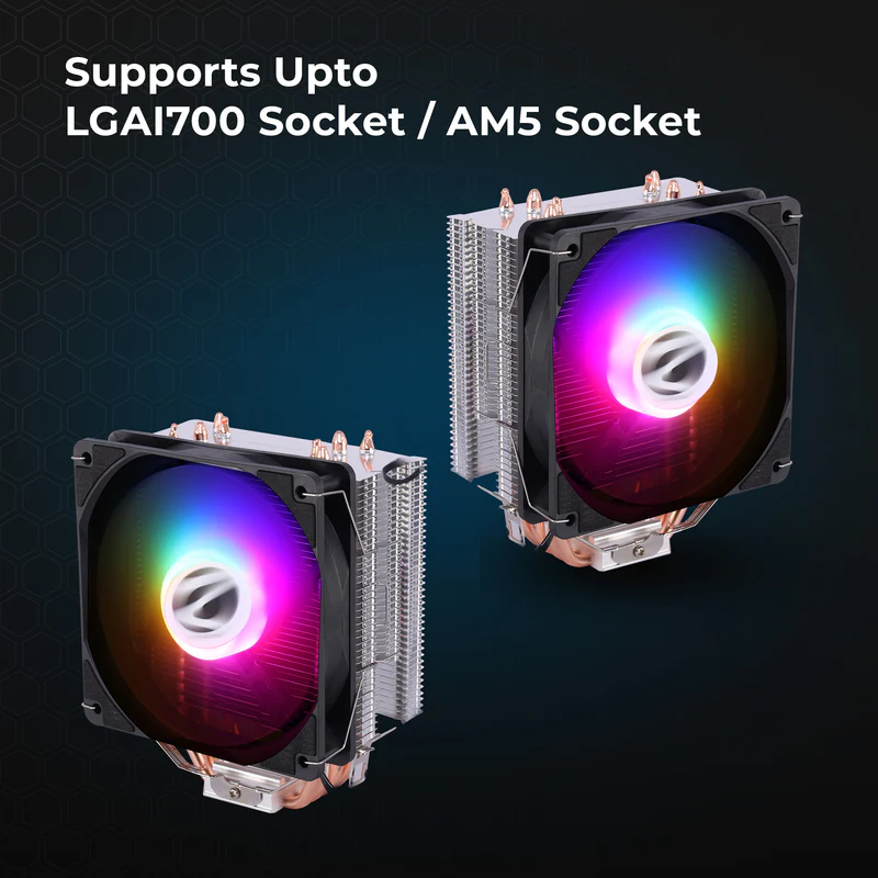 Equipped with 4 copper heat pipes and an aluminum heat sink, the cooler efficiently dissipates heat from the CPU, maintaining system stability and longevity. The RGB lighting on the fan adds a stylish touch, complementing your gaming setup with vibrant, customizable colors.