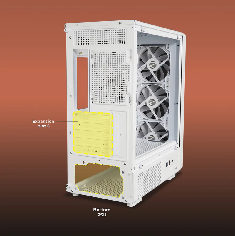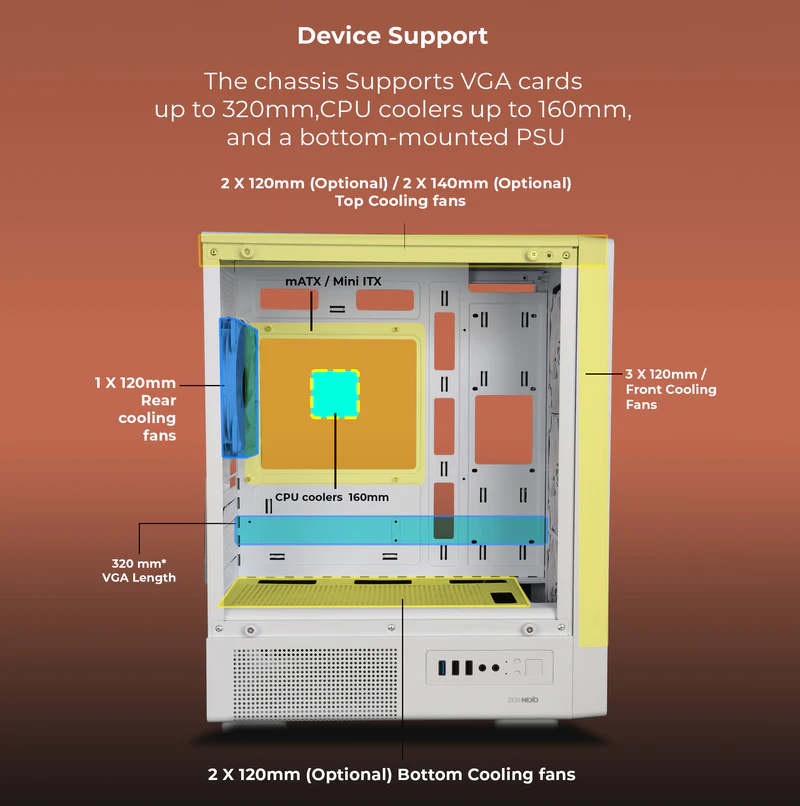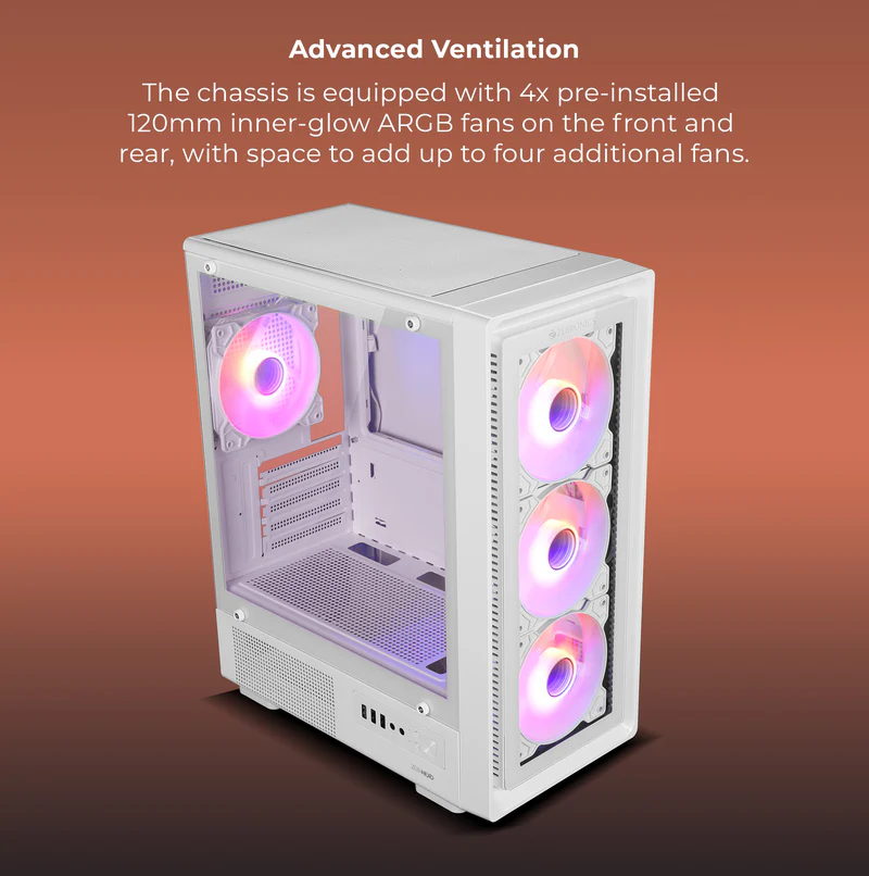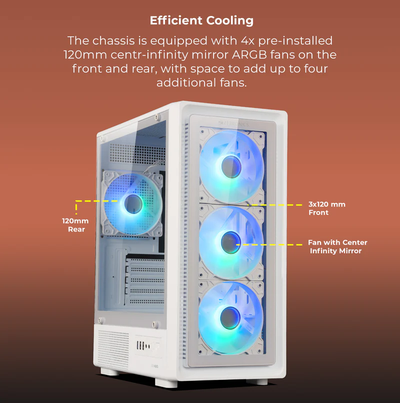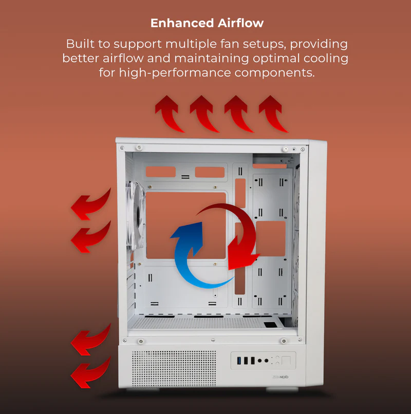Designed for exceptional airflow, the ZEB-NEXO features 3×120mm ARGB front fans and 1×120mm ARGB rear fan, including a Center Infinity Mirror Fan that elevates your setup with dazzling lighting effects. Whether you are gaming, streaming, or creating, the cabinet’s optimized ventilation system ensures stable performance under intense workloads.